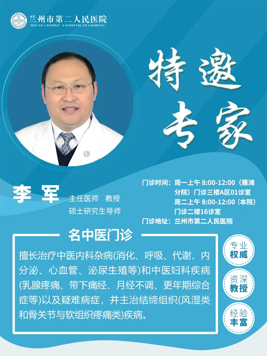 周二上午8:00-12:00(本院)門診二樓16診室門診地址:蘭州市第二人民醫(yī)院
